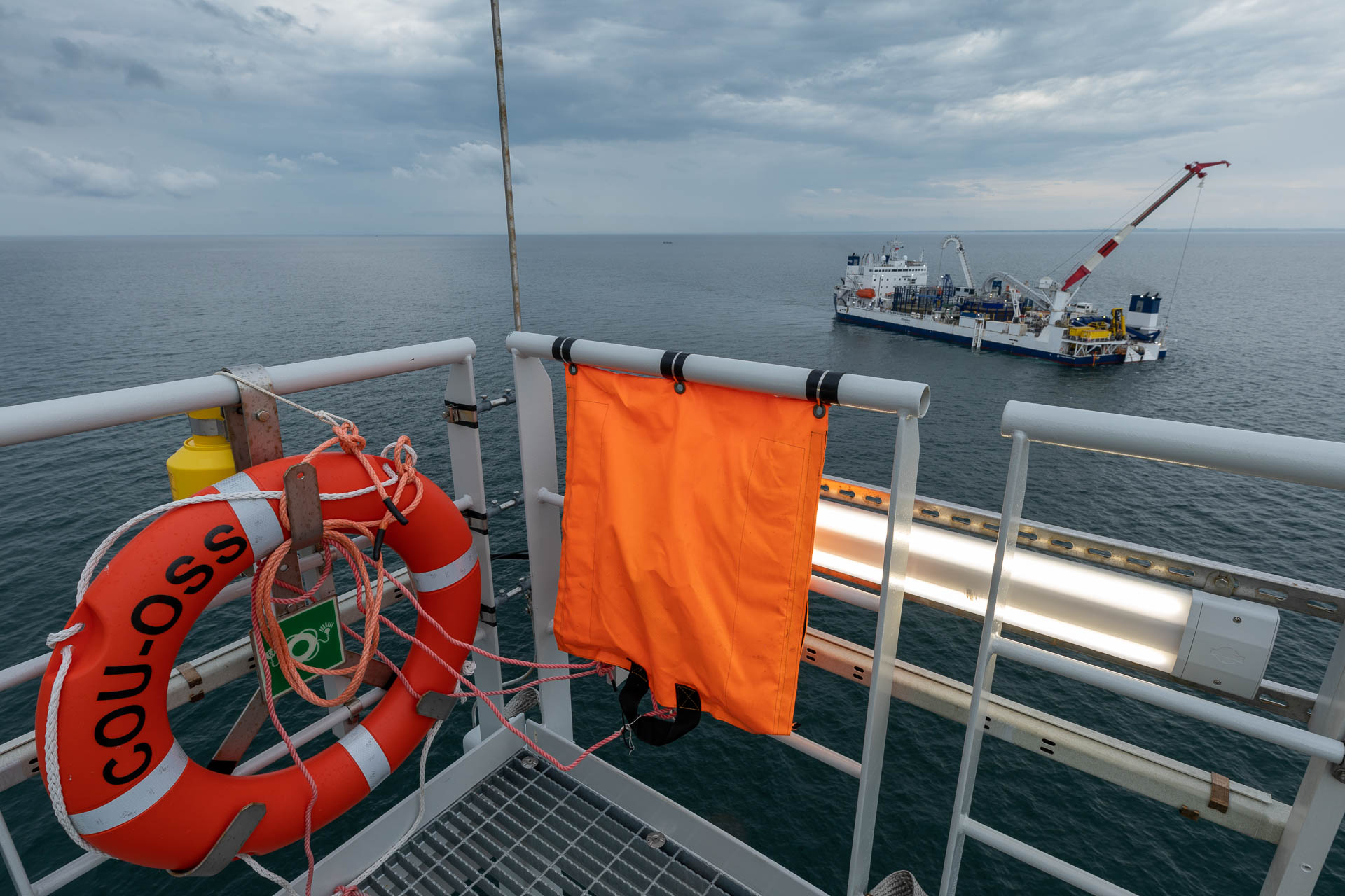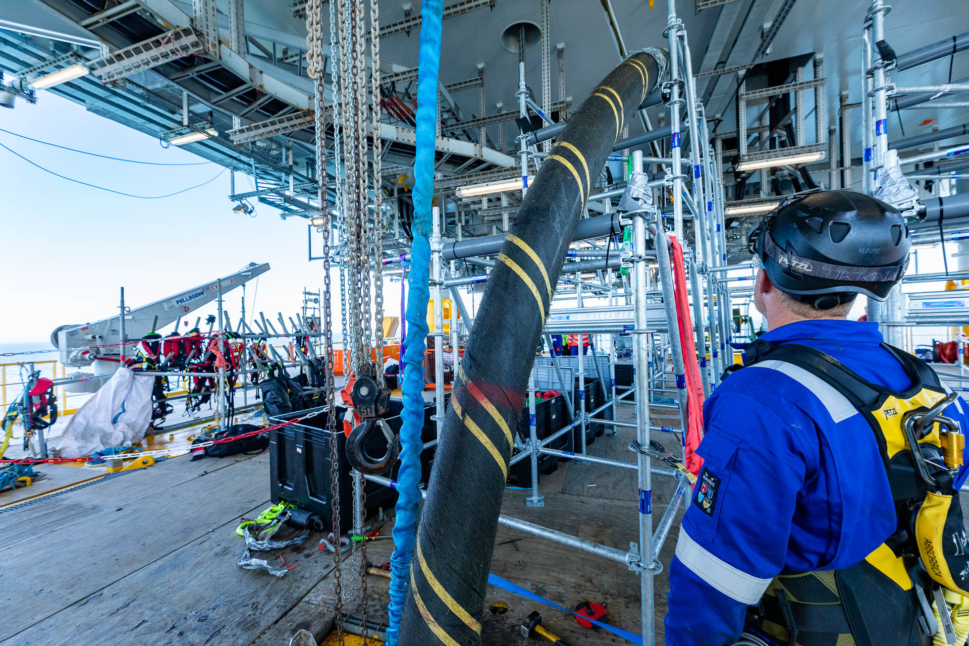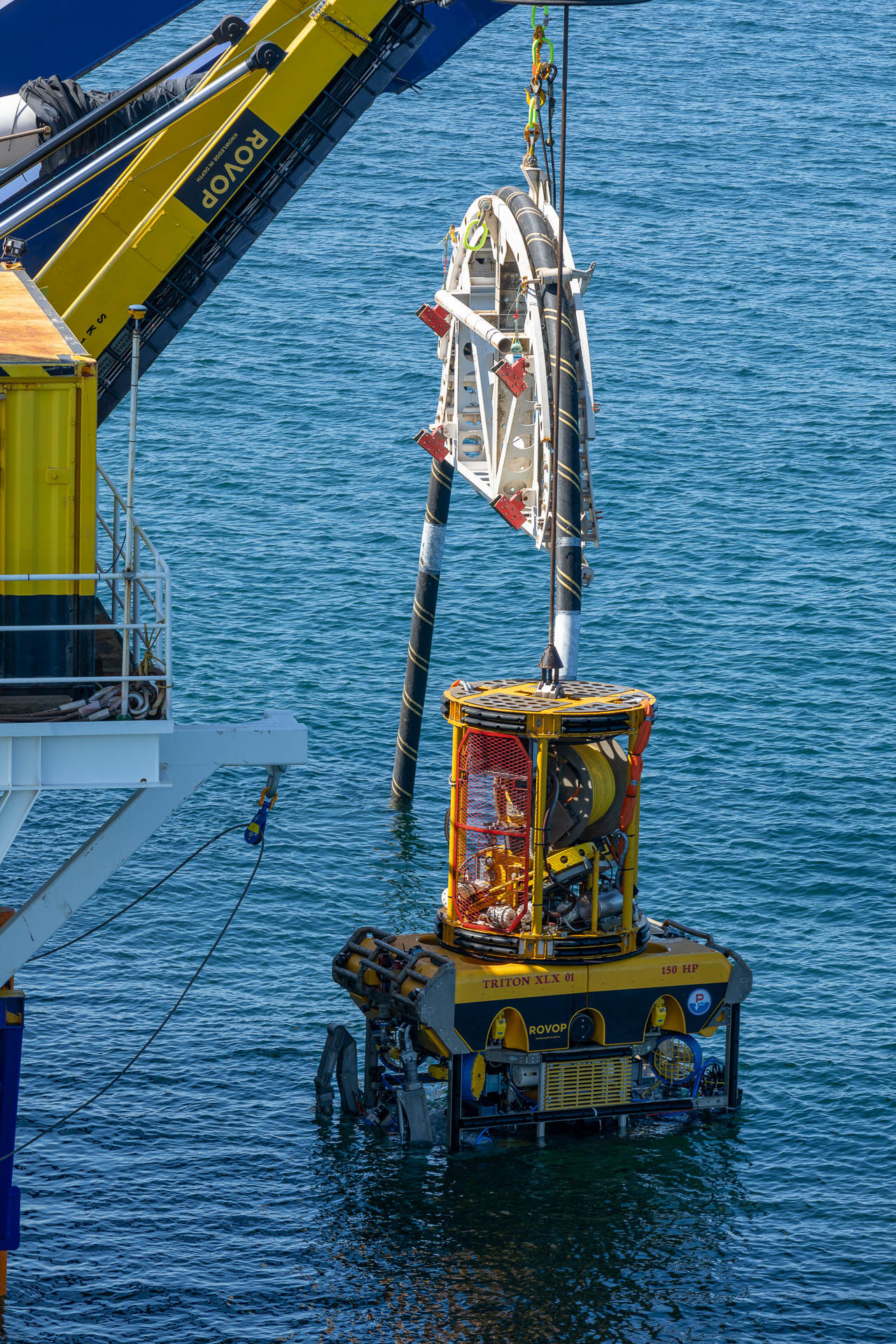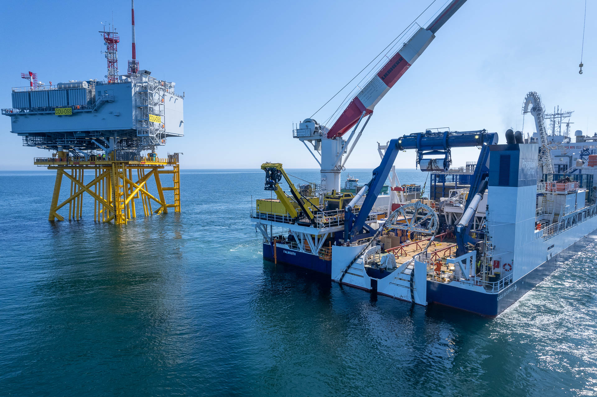 La sous-station électrique du parc éolien de Courseulles vient d’être mise en place. Les câbles sous-marins sont déposés sur le fond marin. Il reste à les connecter à la plateforme. Un navire récupère les câbles, qui sont ensuite tirés vers l’OSS.