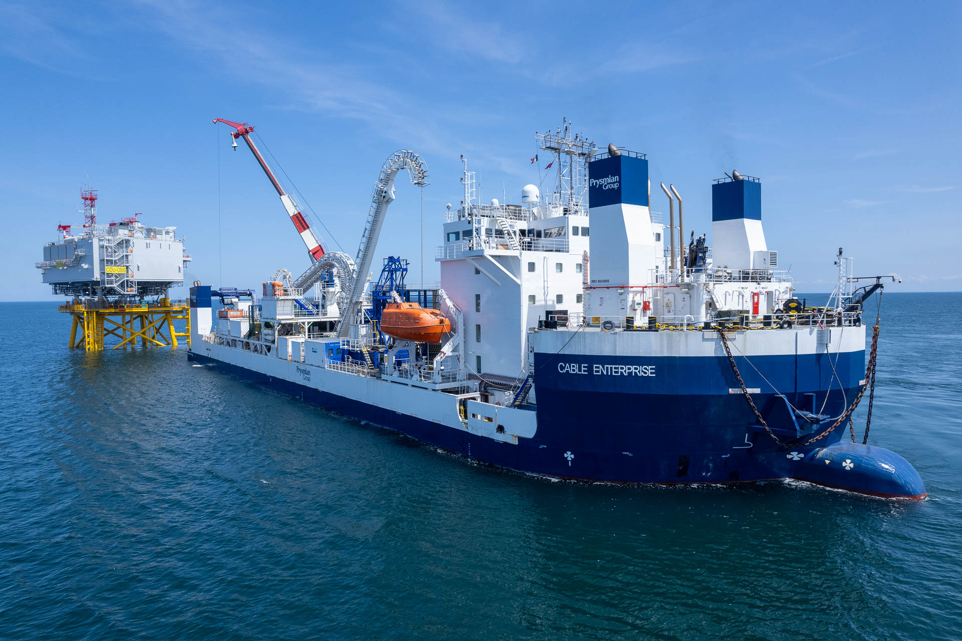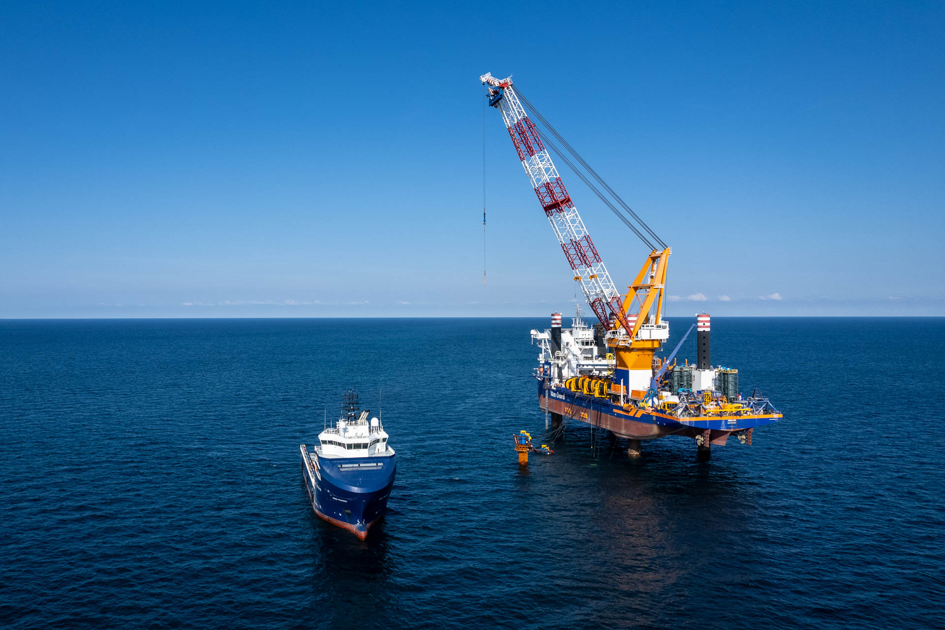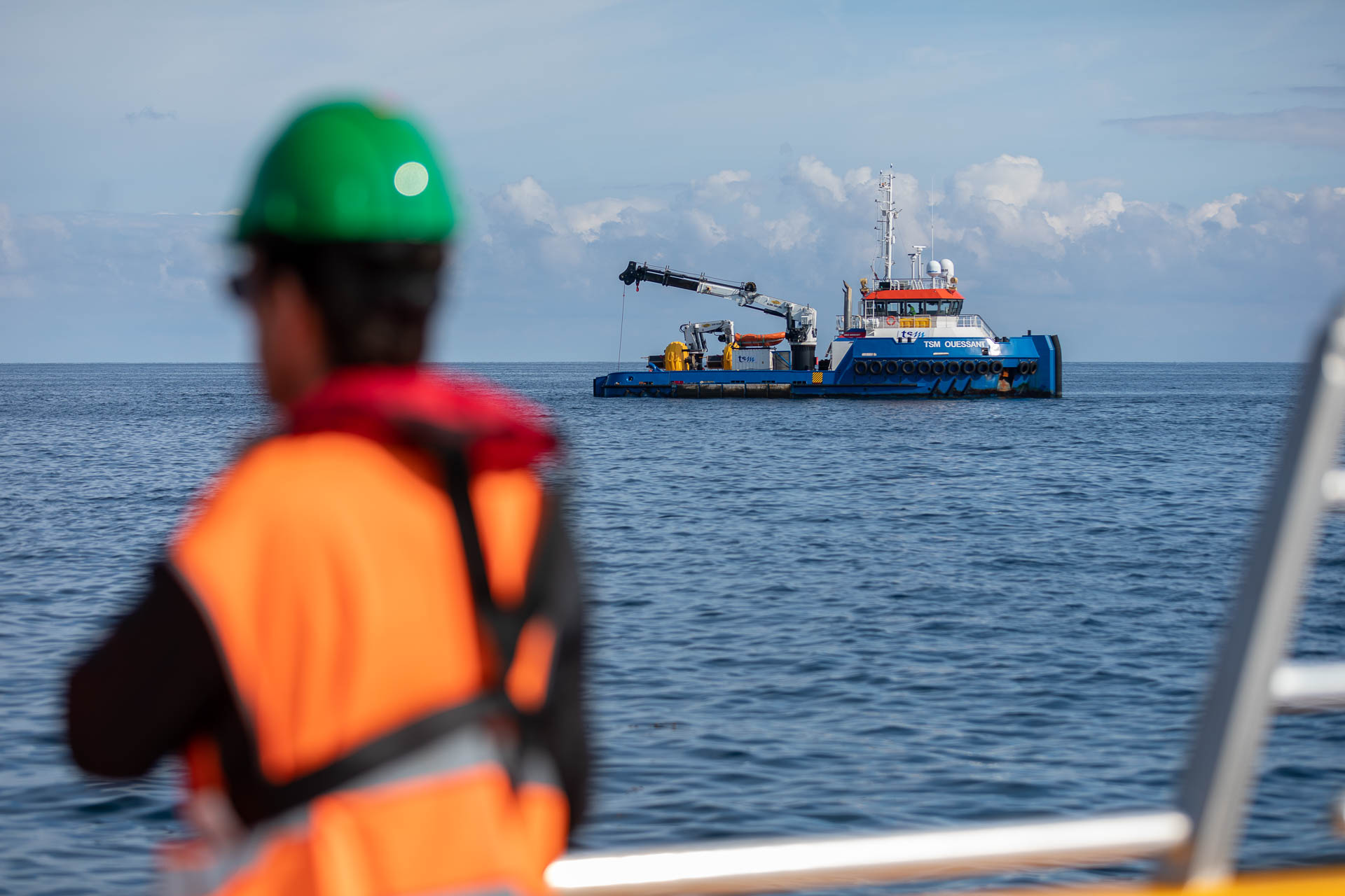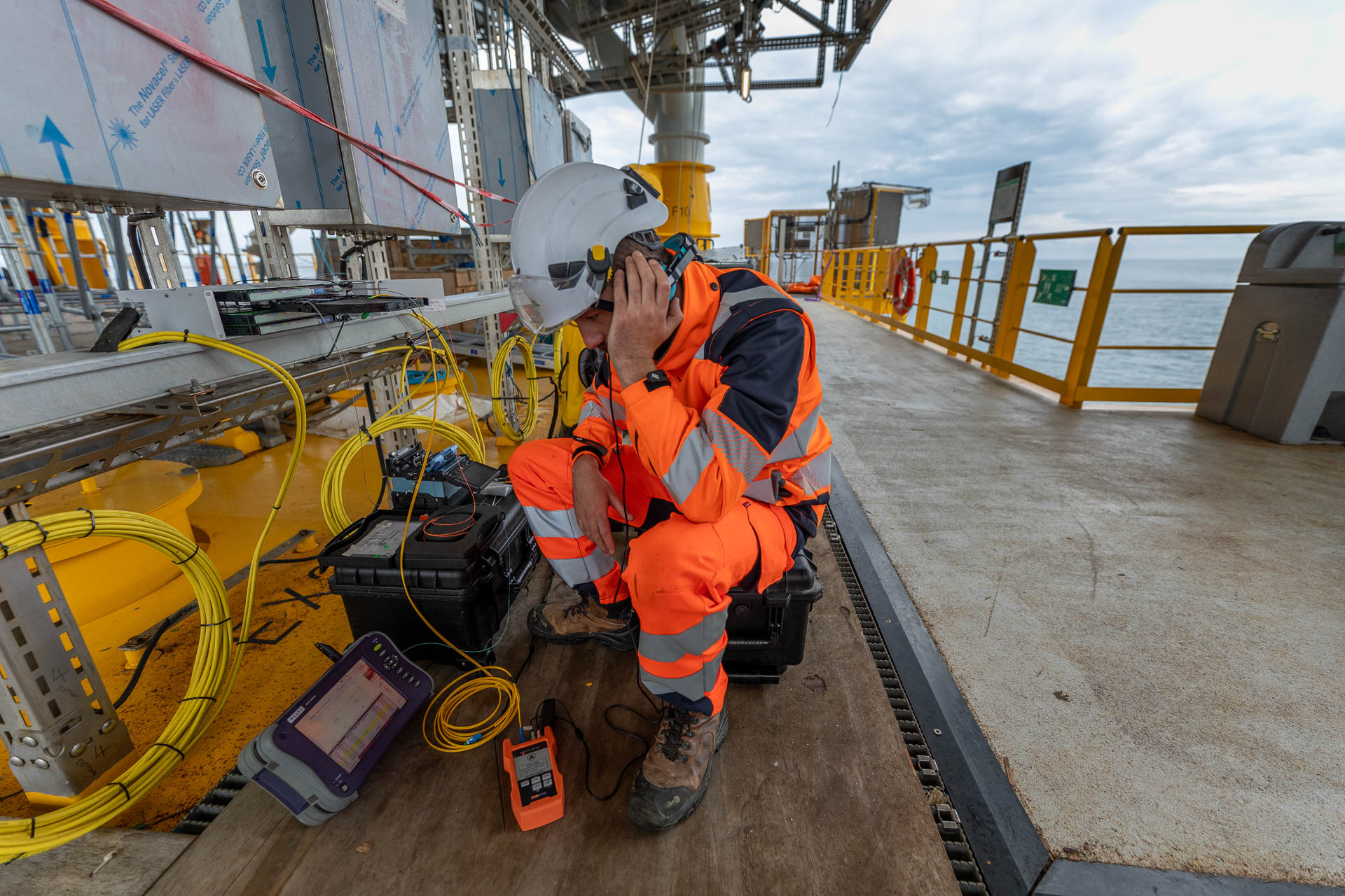 La sous-station électrique du parc éolien de Courseulles vient d’être mise en place. Les câbles sous-marins sont déposés sur le fond marin. Il reste à les connecter à la plateforme. Un navire récupère les câbles, qui sont ensuite tirés vers l’OSS.