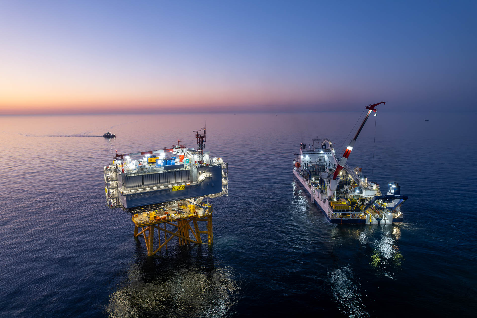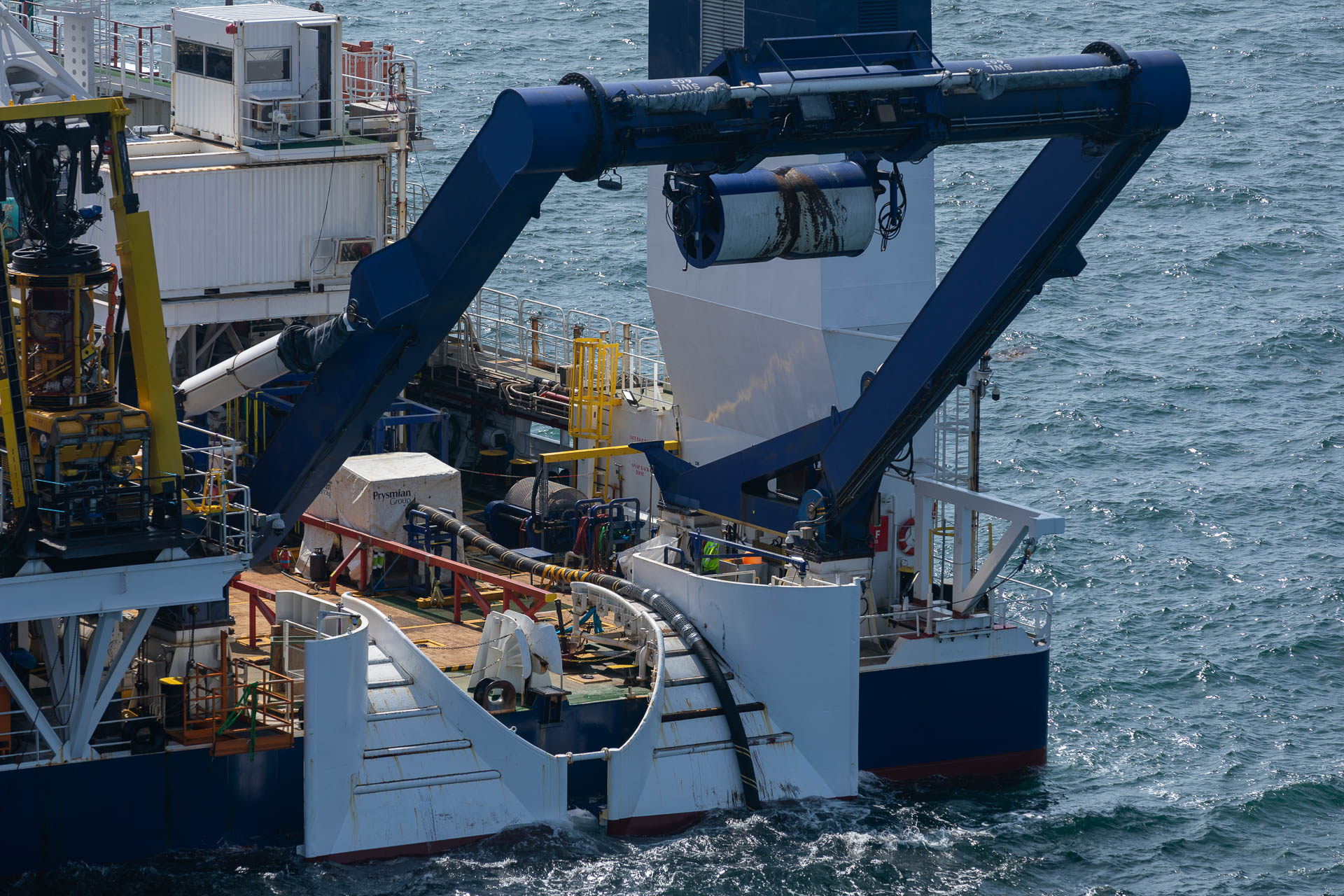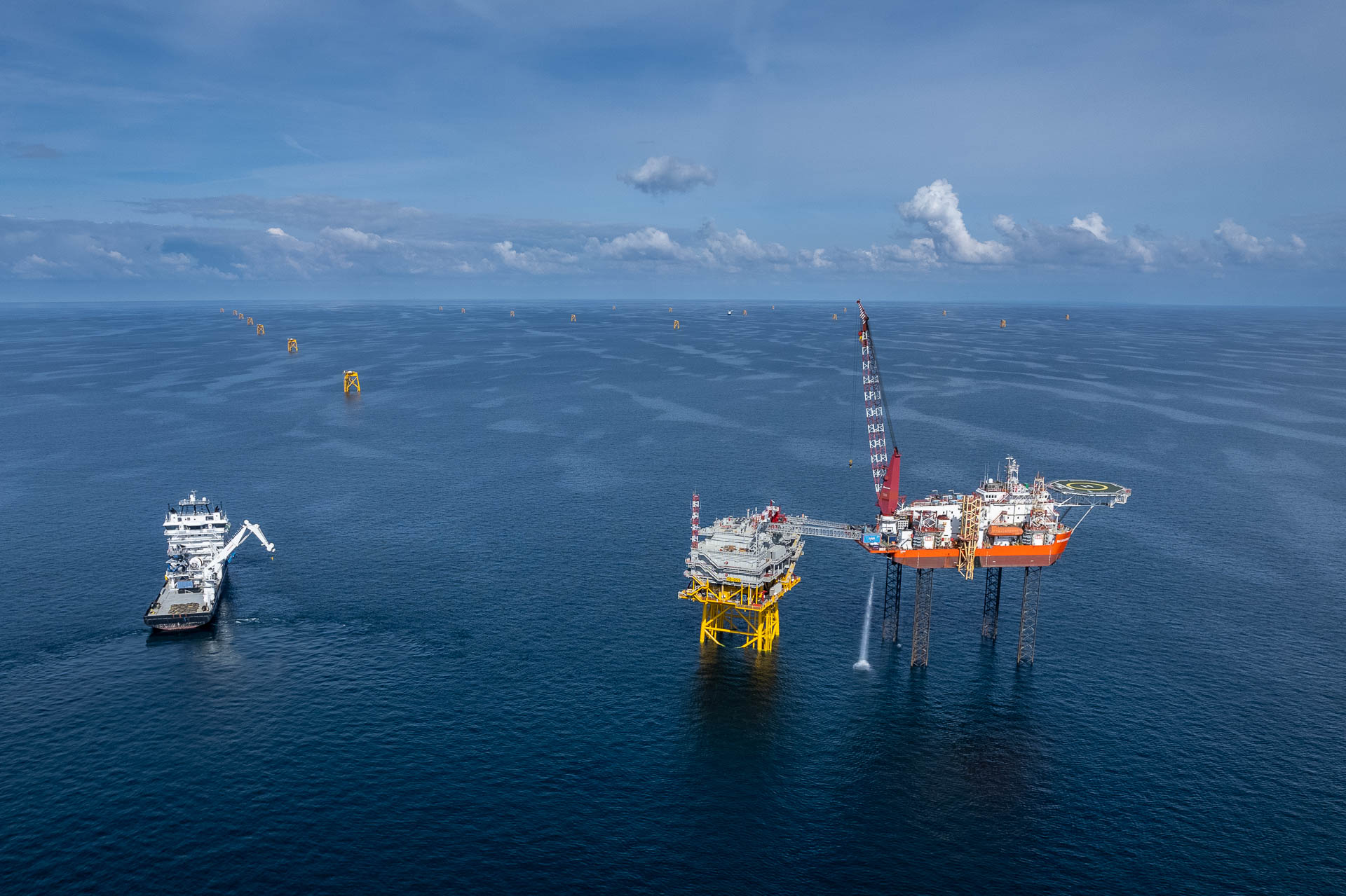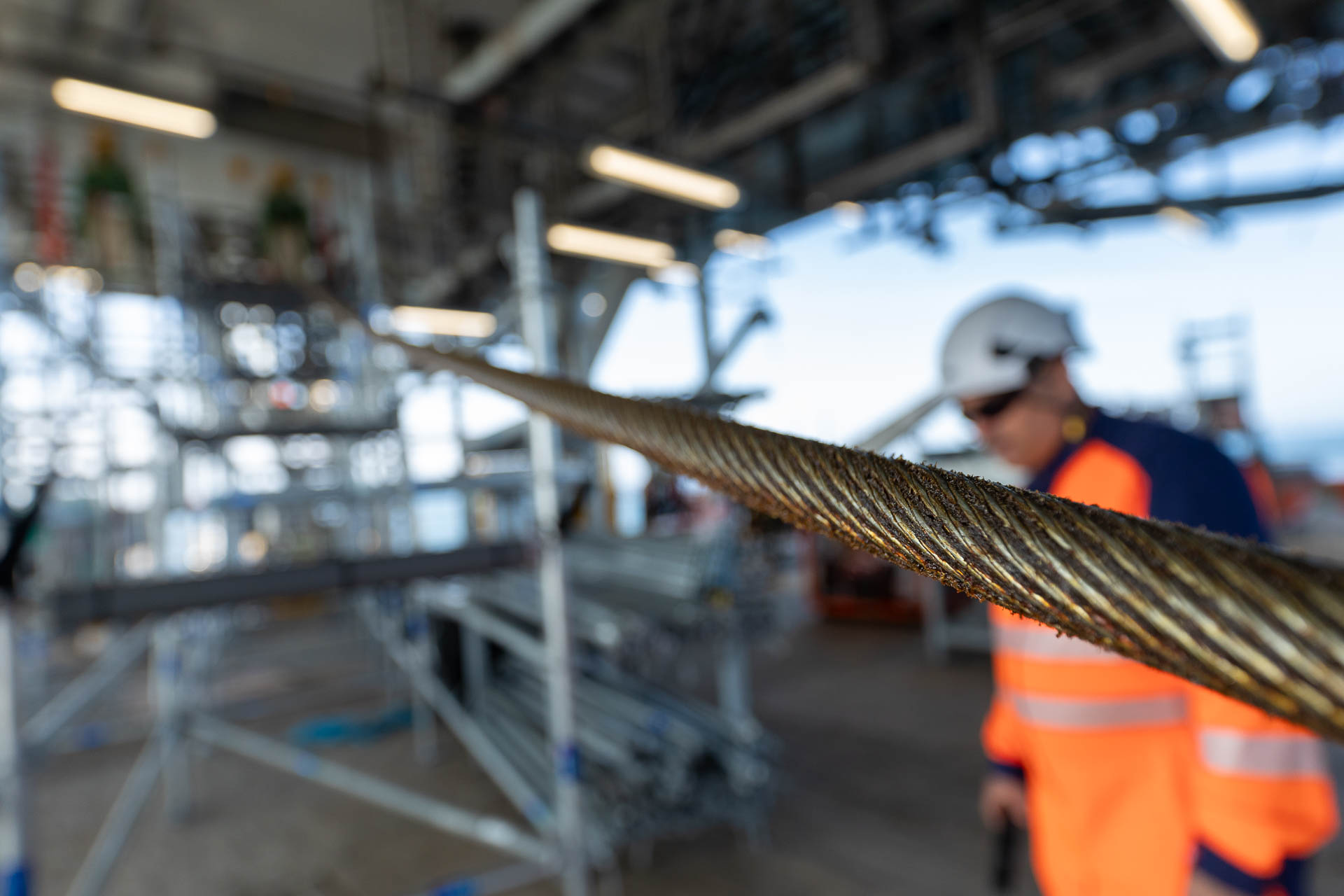 La sous-station électrique du parc éolien de Courseulles vient d’être mise en place. Les câbles sous-marins sont déposés sur le fond marin. Il reste à les connecter à la plateforme. Un navire récupère les câbles, qui sont ensuite tirés vers l’OSS.