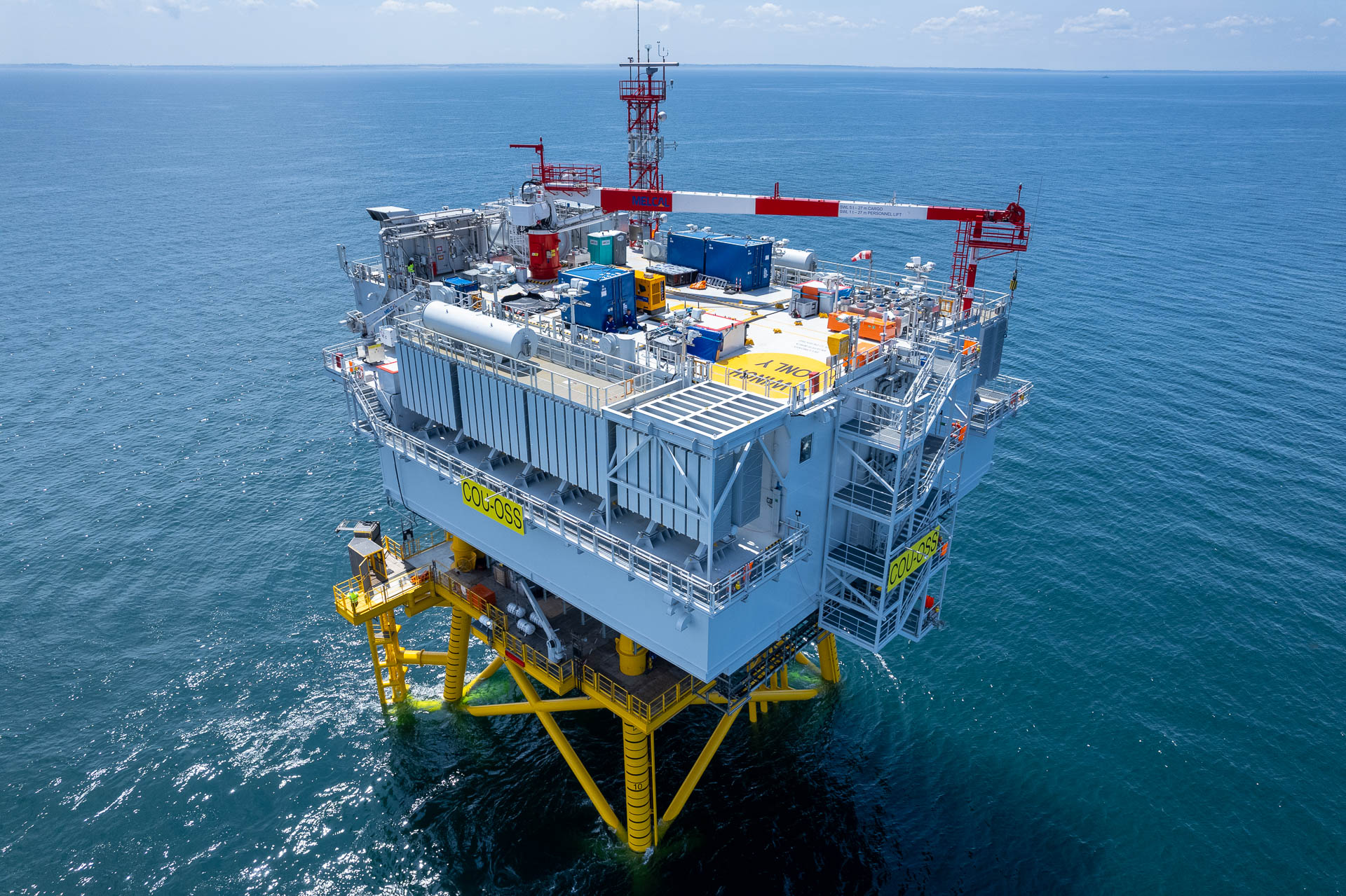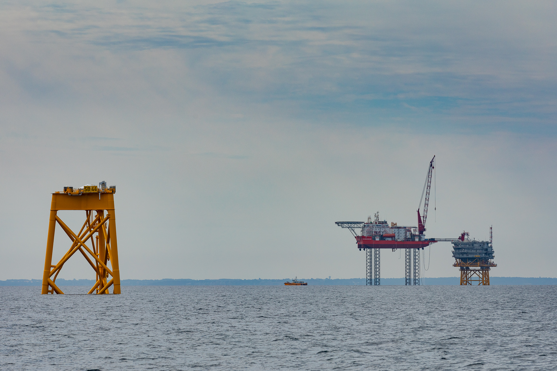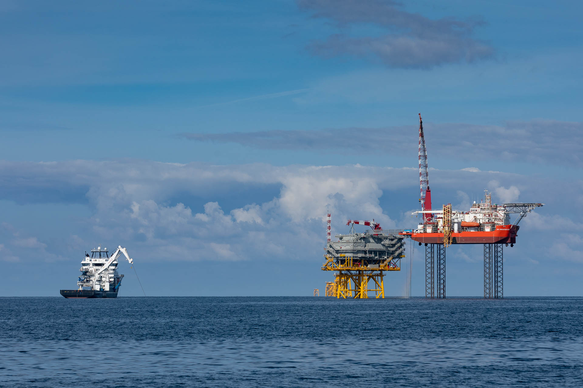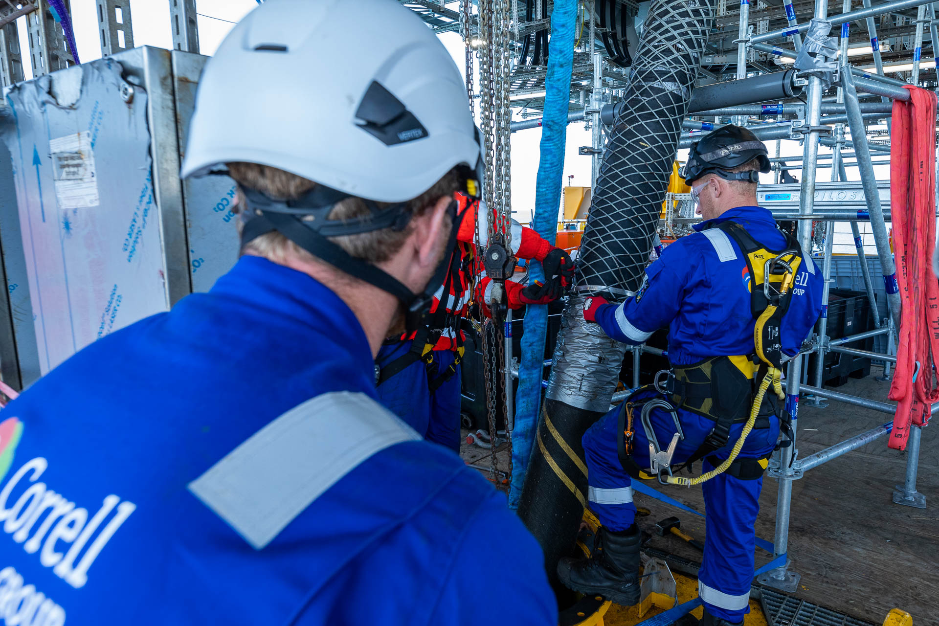 La sous-station électrique du parc éolien de Courseulles vient d’être mise en place. Les câbles sous-marins sont déposés sur le fond marin. Il reste à les connecter à la plateforme. Un navire récupère les câbles, qui sont ensuite tirés vers l’OSS.